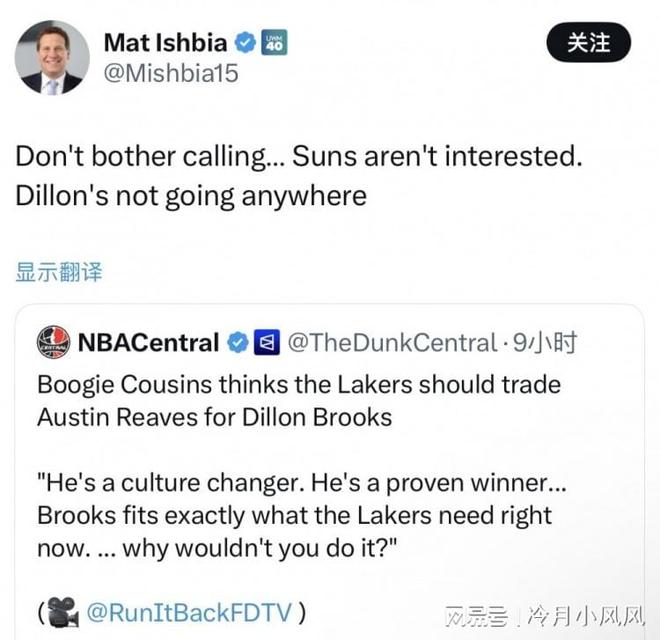 前不久,據(jù)多位記者報(bào)道,湖人正在和菲尼克斯太陽(yáng)商討一筆三換一交易,具體為湖人出八村塁、克內(nèi)克特和一個(gè)首輪選秀權(quán)換太陽(yáng)鋒線球員狄龍布魯克斯,湖人希望狄龍的到來(lái)能提升球隊(duì)外線得分火力和側(cè)翼防守能力。本賽季至今,狄龍布魯克斯打出了生涯最佳的表現(xiàn),累計(jì)出戰(zhàn)29場(chǎng),場(chǎng)均上場(chǎng)30.9分鐘,得到21.4分3.1籃板1.7助攻1.3搶斷,三項(xiàng)命中率為46.1%、34.3%和83.8%,其中場(chǎng)均得分、場(chǎng)均投籃數(shù)、命中數(shù)、投籃命中率均創(chuàng)下生涯新高。昨日,前nba球員考辛斯甚至建議如果太陽(yáng)覺(jué)得籌碼不夠,湖人可以加入里夫斯。