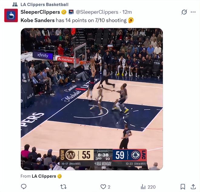 快船記者Lauren Rosen:桑德斯三節(jié)拿到20分已經(jīng)創(chuàng)造生涯新高,微波爐球員。