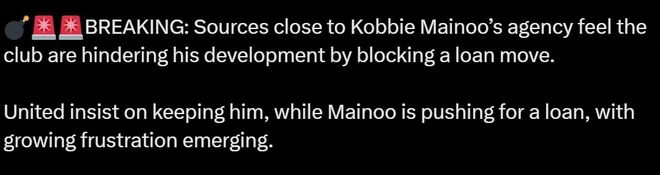 據報道,曼聯(lián)目前對梅諾的情況越發(fā)感到不滿(mǎn),主要原因在于他和經(jīng)紀人的缺乏耐心。曼聯(lián)一直相信他很有前途,遺憾的是,梅諾的團隊先是索取高薪,隨后在失去主力位置時(shí)只想著(zhù)走人,而沒(méi)有積極改變自己,而是覺(jué)得阿莫林阻礙了他的發(fā)展。