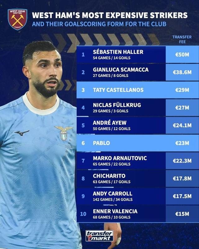 德轉(zhuǎn)統(tǒng)計(jì)了西漢姆聯(lián)隊(duì)史引進(jìn)花費(fèi)最多的十名鋒線球員,其中,阿萊以5000萬歐元的轉(zhuǎn)會(huì)費(fèi)排名榜首,斯卡馬卡第二,今年冬窗加盟球隊(duì)的卡斯特利亞諾斯、巴勃羅分列第三、第六位。