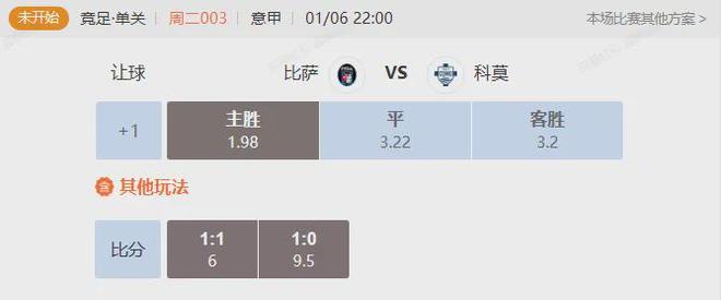 初始科莫客讓0.75高位起步,后市客隊(duì)繼續(xù)拉升;兩隊(duì)本賽季成績差距較大,但給到客場0.75的讓步未免有些托大,畢竟老牌勁旅尤文在客場也只讓一球,雖然科莫最近兩個(gè)賽季實(shí)力提升明顯且本場前場核心帕斯復(fù)出,但比薩不敗率不錯(cuò)且保級戰(zhàn)意具備,意味夸大客隊(duì)優(yōu)勢并一路走高添利的動作并不合理,歐洲方面,目前平局也處于3.45的相對低位,因此綜合考慮,本場看好比薩主場爆冷不敗。